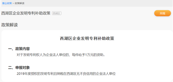 西湖区企业发明专利补助政策