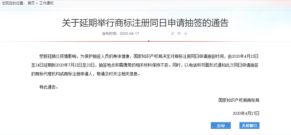 受新冠肺炎疫情影响,为保护抽签人员的身体健康,国家知识产权局决定对商标注册同日申请抽签时间,由2020年4月23日至24日延期到2020年7月22日至23日,抽签地点和需携带的相关材料保持不变。同时,以电话和书面形式通知此次同日申请抽签的商标代理机构或商标注册申请人,敬请及时关注相关信息。
