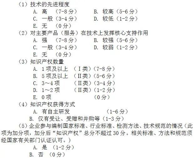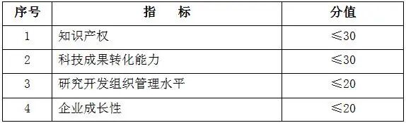 企业创新能力主要从知识产权、科技成果转化能力、研究开发组织管理水平、企业成长性等四项指标进行评价。各级指标均按整数打分,满分为100分,综合得分达到70分以上(不含70分)为符合认定要求。四项指标分值结构详见下表: