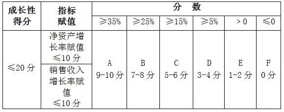 以上两个指标分别对照下表评价档次(ABCDEF)得出分值,两项得分相加计算出企业成长性指标综合得分。