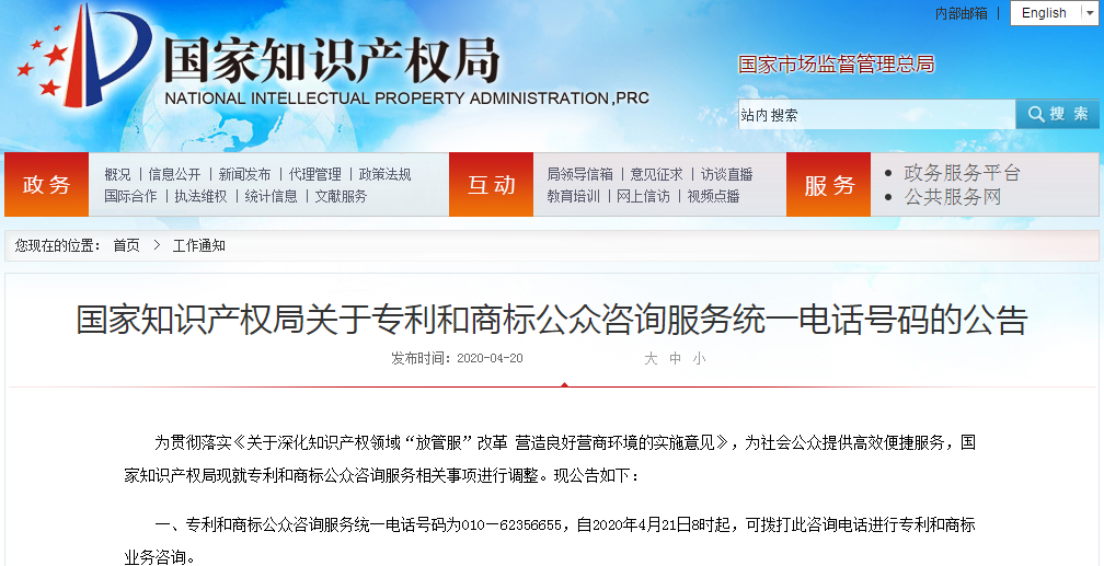 一、专利和商标公众咨询服务统一电话号码为010—62356655,自2020年4月21日8时起,可拨打此咨询电话进行专利和商标业务咨询。