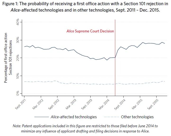 1.爱丽丝案增加主题资格的驳回 爱丽丝标准的早期实施导致基于不符合专利资格的主题驳回的增加。对于与爱丽丝案相关的技术,在爱丽丝案之后的18个月内,首次审查不符合专利资格主题驳回的机会增加了31%。 这一增加反映了爱丽丝案决定的两个方面的影响。首先,将爱丽丝案标准应用到其他技术领域可能会导致更多的驳回;其次,经过专业培训的法官、律师和审查员可能采用合理但又不同的爱丽丝标准解释。 2.爱丽丝案增加专利审查的不确定性 爱丽丝标准的早期实施增加了受影响技术在专利审查第一阶段的不确定性。对专利申请人来说,受爱丽丝案影响的技术的审查过程变得更加不可预测。在爱丽丝案之后的18个月里,相关技术在专利审查第一阶段中关于专利主题的资格的不确定性增加了26%。 不确定性的增加反映了爱丽丝标准语言解释的自由度,激发了各种各样的观点。这种范围的扩大导致主题相关的驳回决定在不同的审查员中具有较高的可变性。 3.USPTO指南扭转主题资格驳回的上升趋势 针对与相关的专利主题资格审查,USPTO于2014年6月25日提供了初步审查说明,并于当年12月发布了更实质性的专利主题资格审查临时指南,旨在使专利审查实践与既定法律保持一致。但是,由爱丽丝案引起的第101条驳回的增长一直持续到2018年4月USPTO的伯克海默备忘录和随后于2019年1月修订的《专利主题事项资格指南》(2019 PEG)发布之前。PEG公布一年以后基于不符合专利资格的理由而被驳回的可能减少了25%。 4.USPTO指南降低审查不确定性 伯克海姆备忘录发布后,专利审查第一阶段的不确定性开始降低,相关技术驳回的不确定性下降。2019 PEG公布对审查不确定性具有更大的统计学影响。该指南公布一年以后,受爱丽丝影响的技术在专利审查第一阶段的专利主题资格的不确定性降低了44%。证据表明,2019 PEG为决策过程提供了清晰性和结构性,从而降低了在主题资格确定中跨审查员观察到的变异程度。 (来源:中科院知识产权信息 作者:中科院IP信息 检索/校译:许轶 编译:)