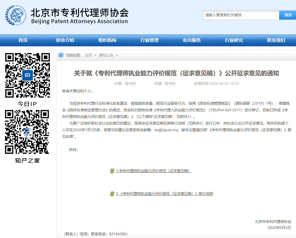 为更广泛地听取社会公众的意见和建议,现将该征求意见稿及其修订说明(见附件2)进行公布,向社会公众公开征求意见。相关机构或个人可在2020年7月3日前,将意见和建议反馈至我会邮箱:bp@bjpaa.org,邮件主题请注明“《专利代理师执业能力评价规范(征求意见稿)》意见反馈”。