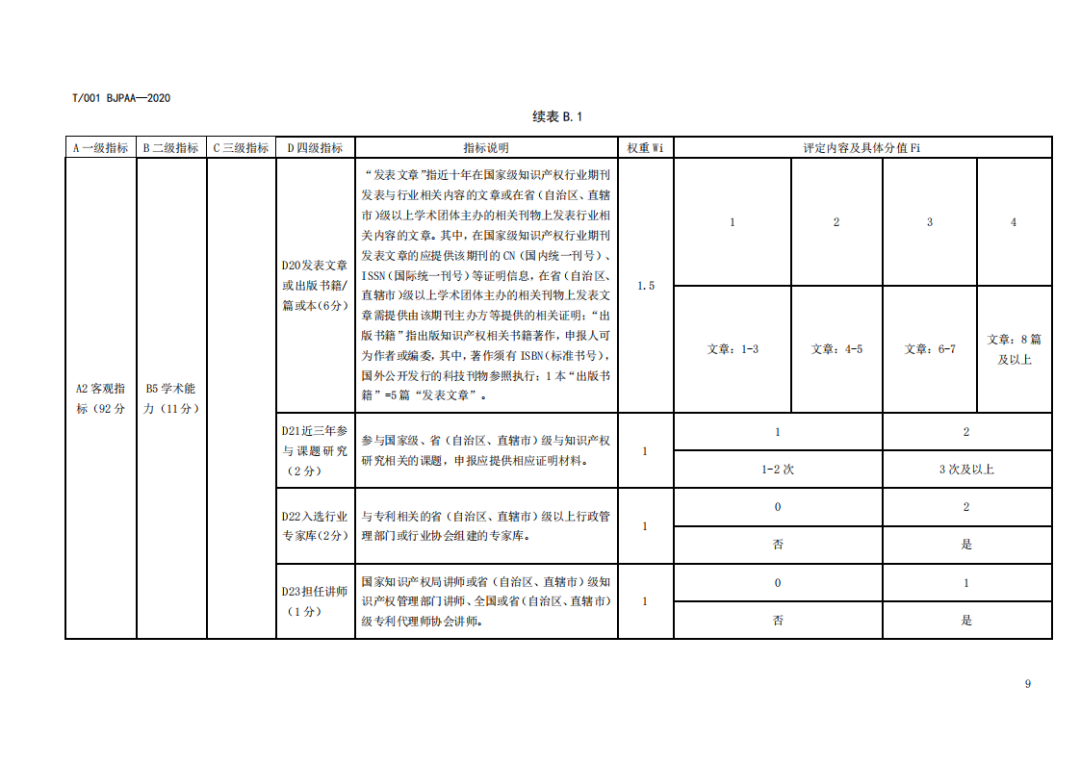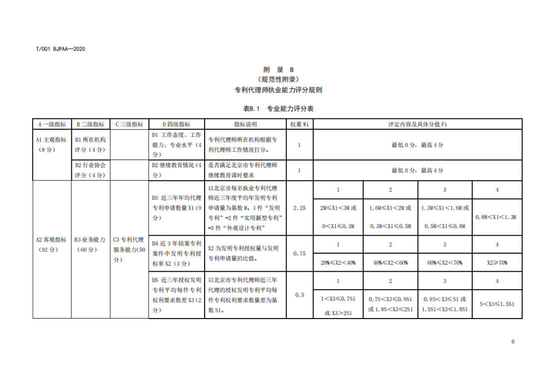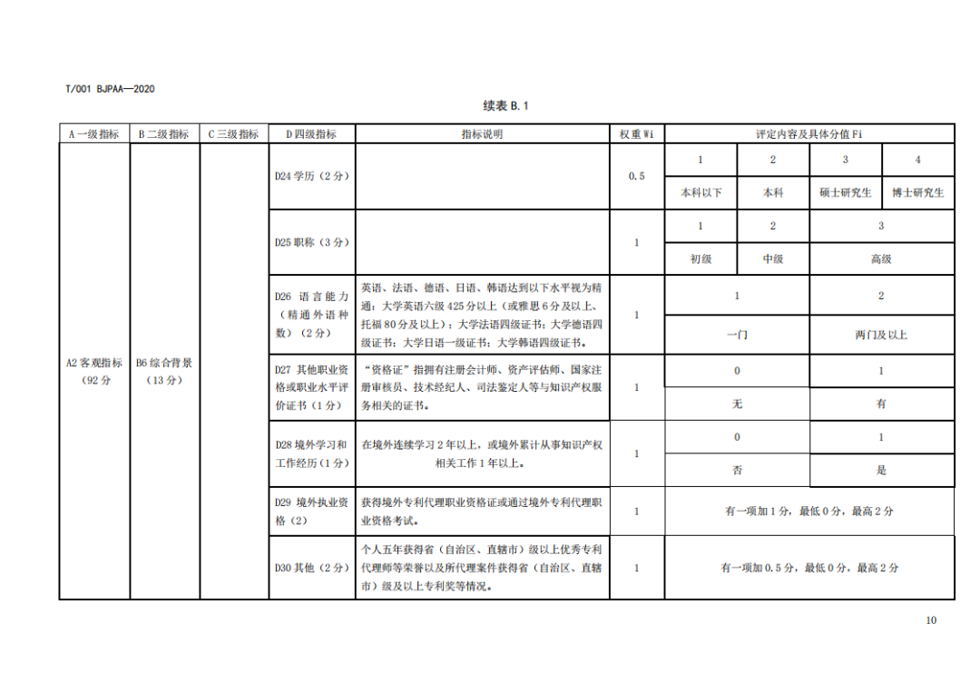 进一步调整主观评分分值,将原《评价规范》表 B.1 中审协评分的“沟通能力、专业水平(D2)”改为“继续教育情况”由北京市专利代理师协会评分,并将其分值由 6 分降为 4 分。