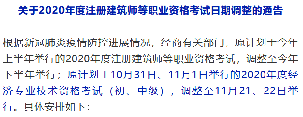 原标题:关于2020年度注册建筑师等职业资格考试日期调整的通告