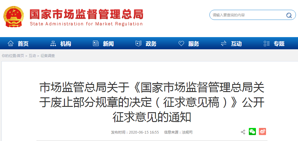 市场监管总局关于《国家市场监督管理总局关于废止部分规章的决定(征求意见稿)》公开征求意见的通知