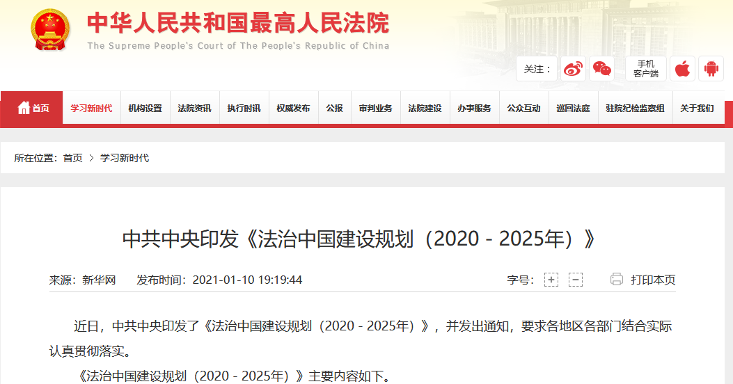 近日,中共中央印发了《法治中国建设规划(2020-2025年)》,并发出通知,要求各地区各部门结合实际认真贯彻落实。